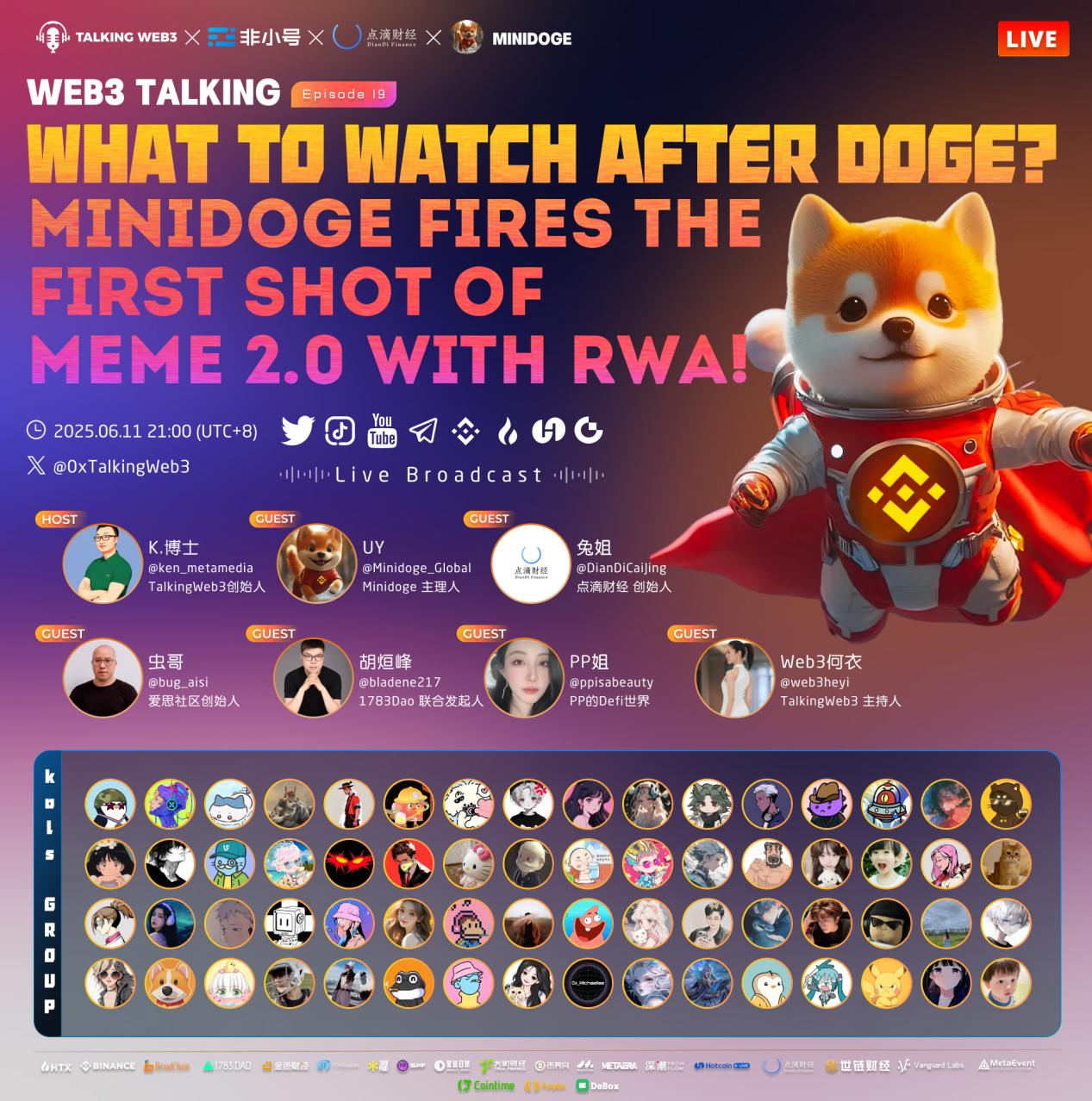 Minidoge's innovative concept and steady execution are attracting the attention of more and more industry leaders. In the upcoming "Web3 Talking" live stream on June 11th at 21:00, Minidoge's leader UY will engage in a deep dialogue with Web3 heavyweights like Tu Jie, founder of DianDiCaiJing, and Chong Ge, founder of the Aisi Community, on pointed topics such as "Is RWA the endgame for Memes?" and "How can physical assets end the 'air coin' era?".