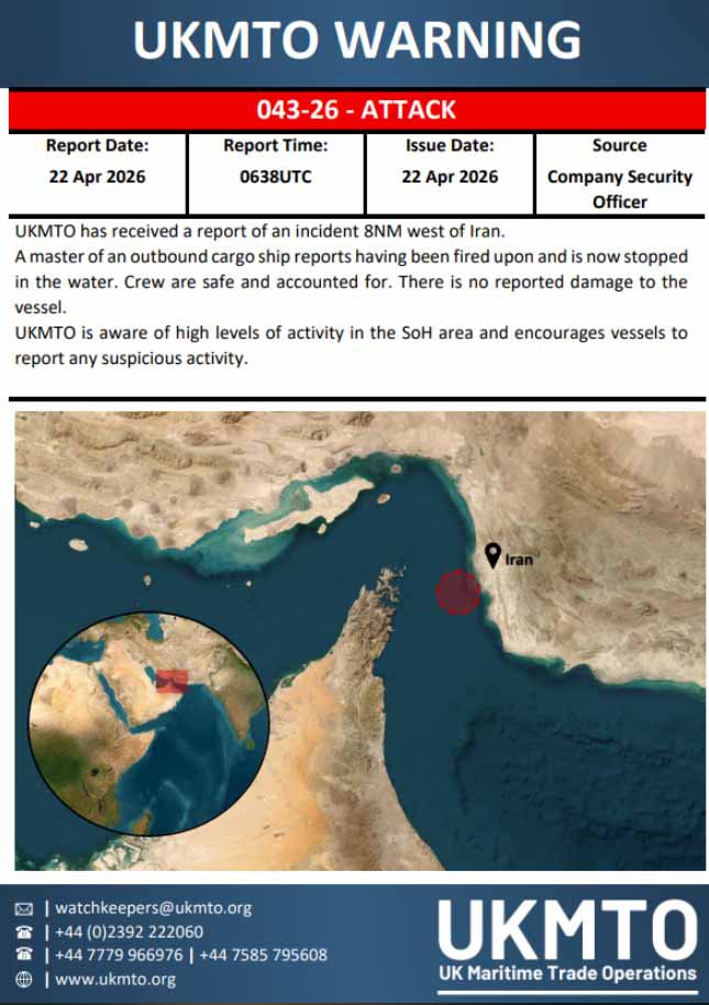Start your day informed with Metro's News Updates newsletter or get Breaking News alerts the moment it happens.Iranian state news agency Nour News reported that the guards only opened fire as the vessel had ‘ignored the warnings’ of the armed forces.An Iranian security official told Al Jazeera that US-owned ships are ‘legitimate targets’ after the US seized the Iranian ship,Touska.Three container ships also attempted to cross the narrow,shallow Strait this morning before stopping near Iranian territorial waters,according to military observers.At least 3 Container ships attempted to cross the strait of Hormuz this morning:- Swiss-owned MSC Francesca (AIS switched off when crossing)- Greek-owned Epaminondas (AIS switched off)- UAE-owned EuphoriaThey are now stopped in/near Iranian territorial waters. https://t.co/rsEmGx2WqX pic.twitter.com/coq9HTFGkL— MenchOsint (@MenchOsint) April 22,2026