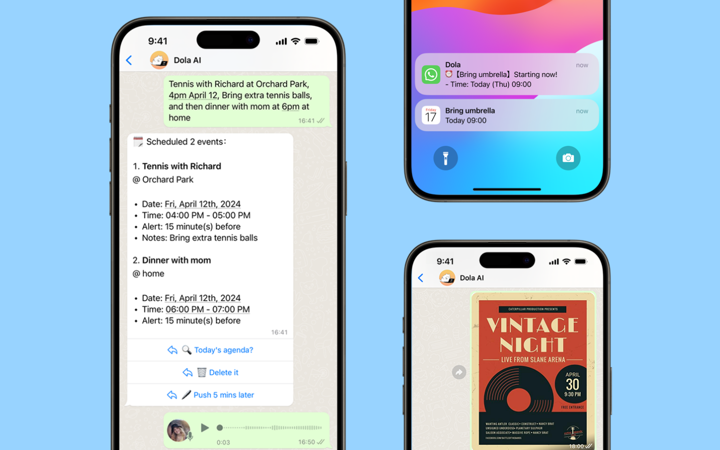 Dola AI simplifies the process of staying organized by seamlessly integrating with users’ messenger apps. Whether it's text, images, or voice messages, Dola effortlessly transforms users’ communications into actionable plans and calendar alerts.