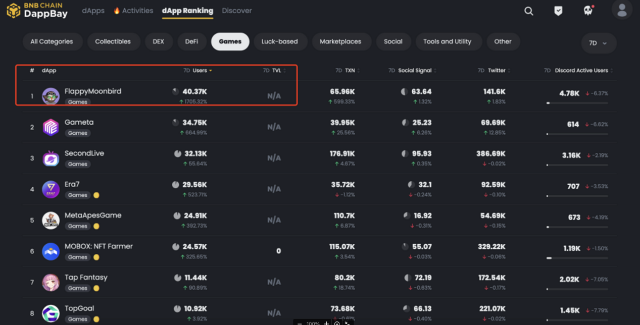 The tokenomics remains an essential aspect that cannot be overlooked in Web3 games, yet finding a flawless solution has been an ongoing challenge. Among the numerous game modes available, competitive games have emerged as the prime choice due to their engaging gameplay and impressive user retention. A recent standout in this realm is FlappyMoonbird, which masterfully exemplifies the strengths of competitive gaming. Combined with its innovative entry fee model and the exclusive $FMB coin as the driving force behind substantial consumption, the game has soared to the top of the BNBChain gaming leaderboard, securing the first position, and has garnered a remarkable second spot, claiming an impressive 11% of the total game users on BNBChain.