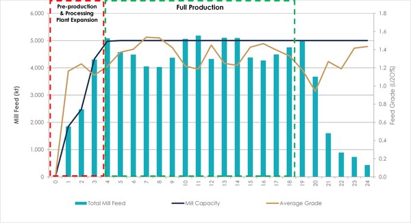 The PEA demonstrates the potential for robust economics,highlighted by a combined after-tax NPV8% of $2.9 billion (US$2.2 billion) and after-tax IRR of 34%. The Project's mine life is projected at 24 years,based on a total extracted Mineral Resource of 66% of total resources defined at CV5,generating significant net cash flows with capital payback achieved in 3.6 years.