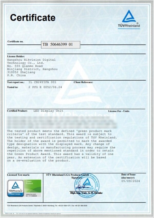 HANGZHOU,China,Oct. 19,2024 --Hangzhou Hikvision Digital Technology Co.,Ltd. ("Hikvision") announced that 16 of its LED display products received the Green Product Mark certification from TÜV Rheinland—the first in the LED display industry achieving this distinction. Based on the 2 PfG E 0052/06.2024 standard,this certification highlights compliance with stringent environmental criteria. TÜV Rheinland,with over 150 years of history,is a member of the UN Global Compact and the Global Ecolabelling Network,making its certifications widely recognized.