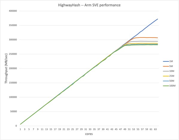 MinIO was also able to achieve significant performance enhancements for the Highway Hash algorithm it uses for bit-rot detection. This is frequently run during both GET (read) as well as PUT (write) operations. SVE support for the core hashing update function delivered the following results: