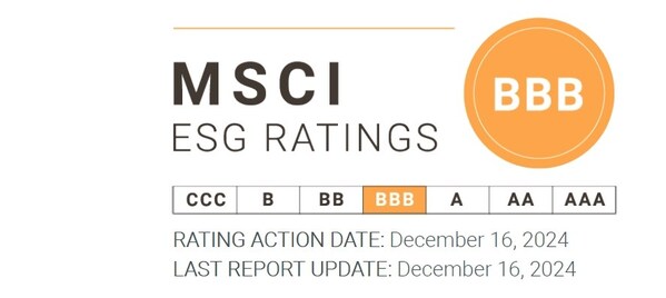 The MSCI ESG ratings have become a global leader in the investment decision-making process of major asset management institutions relying on their authoritativeness and credibility. The rating assesses corporate risk exposure and management across the three critical dimensions: Environmental,Social,and Governance (ESG) factors. It thoroughly evaluates and scores key industry-related issues,including clean technology opportunities.