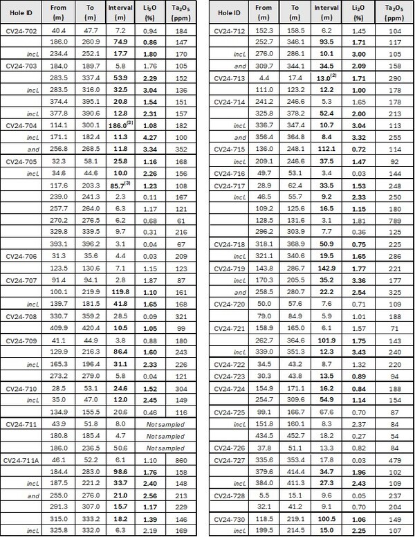 100.5 m at 1.06% Li2O,including 15.0 m at 2.25% Li2O (CV24-730).