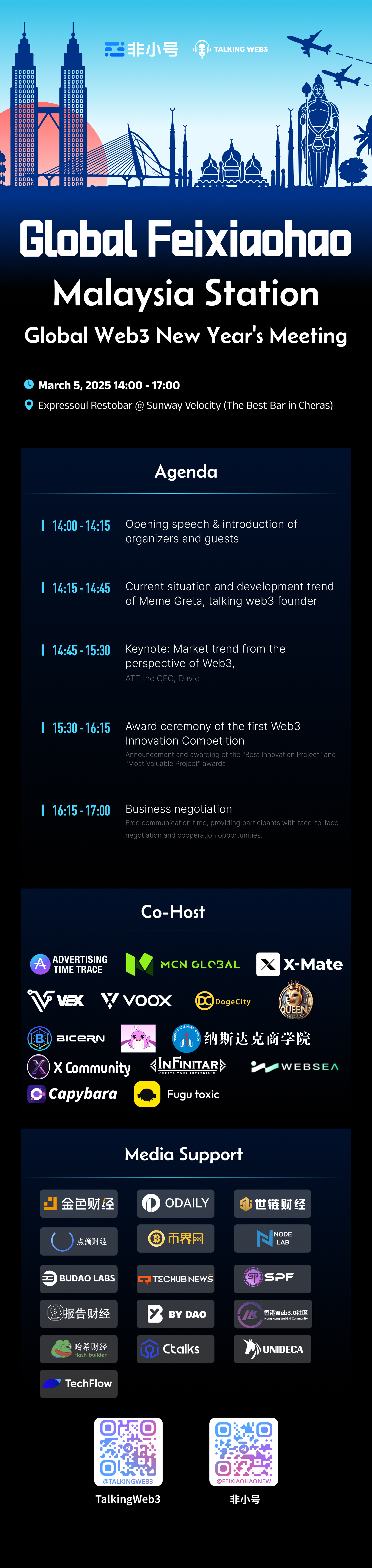 On March 5, 2025, the Global Feixiaohao | 2025 Web3 New Year’s Meeting will take place at Sunway Velocity, Malaysia! Co-hosted by Feixiaohao, Talking Web3, and Nasdaq Business School, this premier event will bring together Web3 leaders, top-tier projects, investors, and community representatives to explore cutting-edge topics, including high-performance blockchain, RWA tokenization, DeFi, GameFi, and the Meme economy.