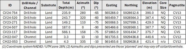 With the geological and block models for the CV5 Pegmatite now handed off to the Feasibility Study team,the Company has further reviewed its core assay dataset and identified multiple distinct areas of considerable cesium (Cs) enrichment (>1% Cs). These include the CV5 and CV12 pegmatites; however,the two (2) largest zones are hosted by the CV13 Pegmatite. Cesium results in drill hole and channel (Figure 1,Table 1,and Table 2) include: