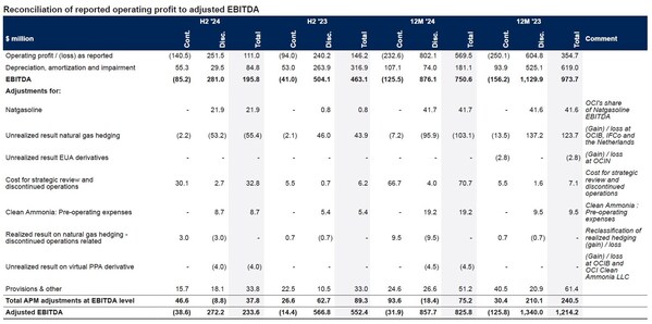 Adjusted EBITDA is an Alternative Performance Measure (APM) that intends to give a clear reflection of the underlying performance of OCI's operations. The main APM adjustments in the second half of 2024 and 2023 relate to: