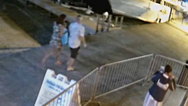 The new footage shows the couple walking on a jetty in Cruz Bay before they board a dinghy to Bane’s 47ft,£500,000 Siren Song catamaran,just six hours before Sarm was reported missing.